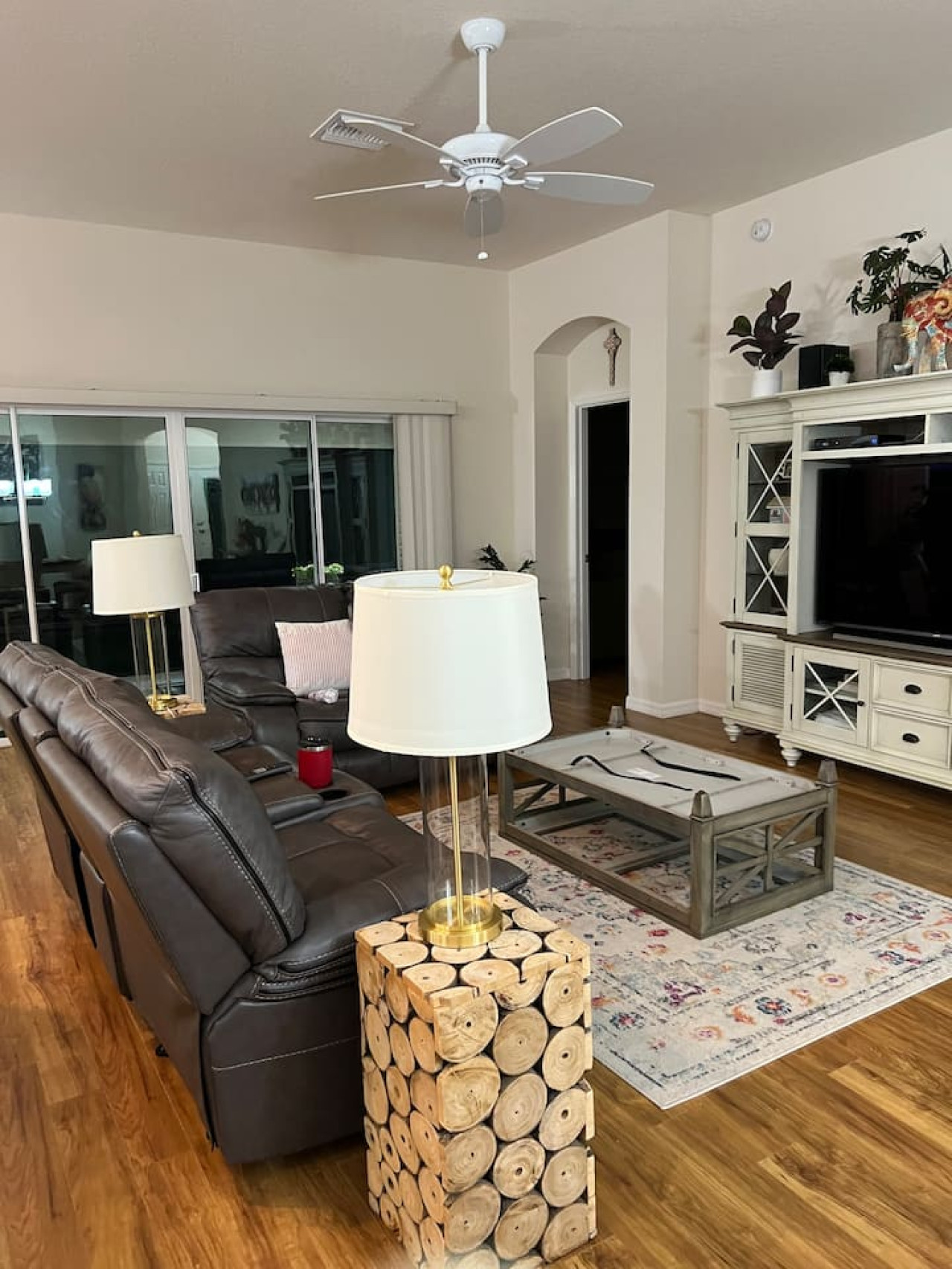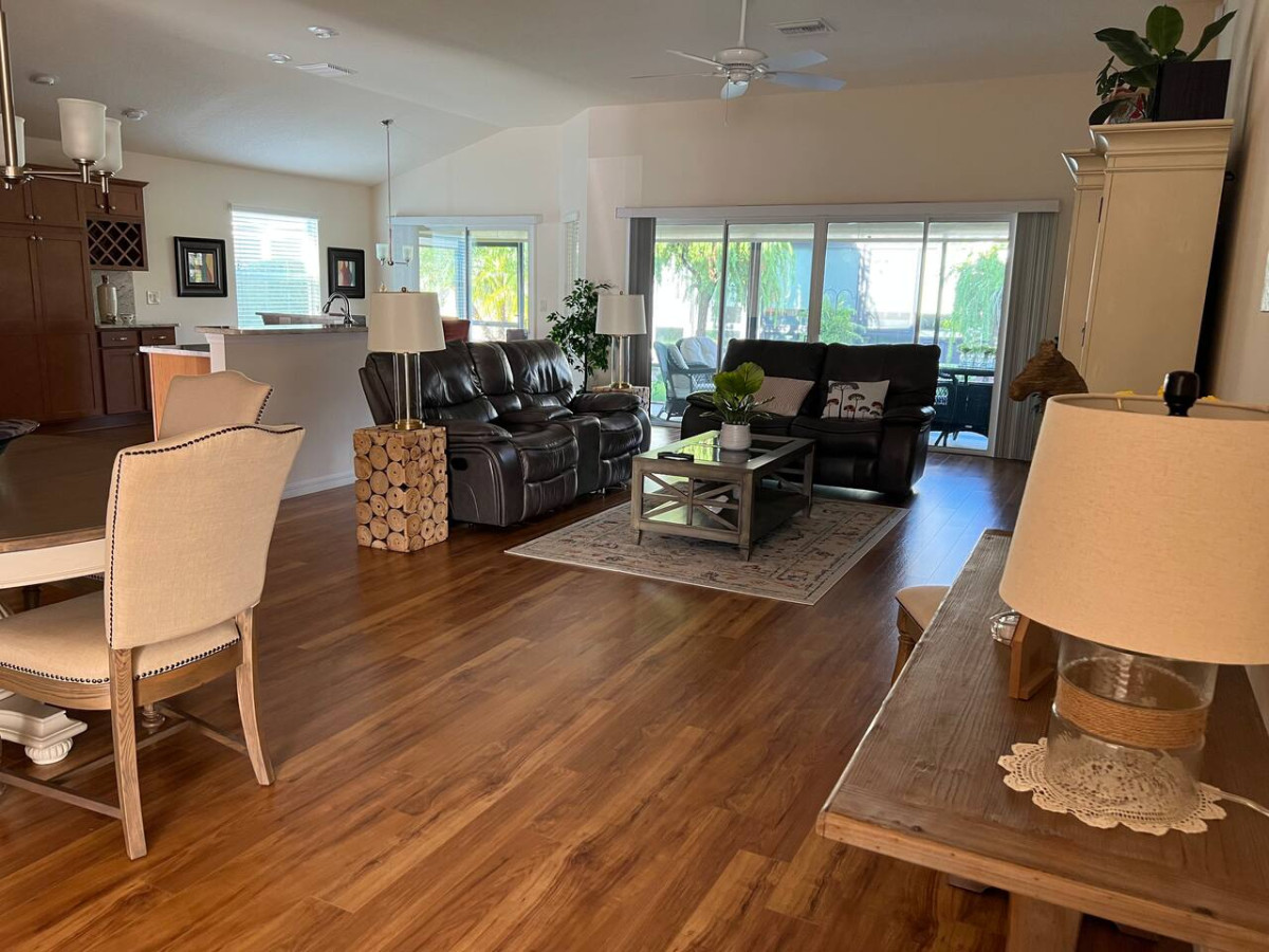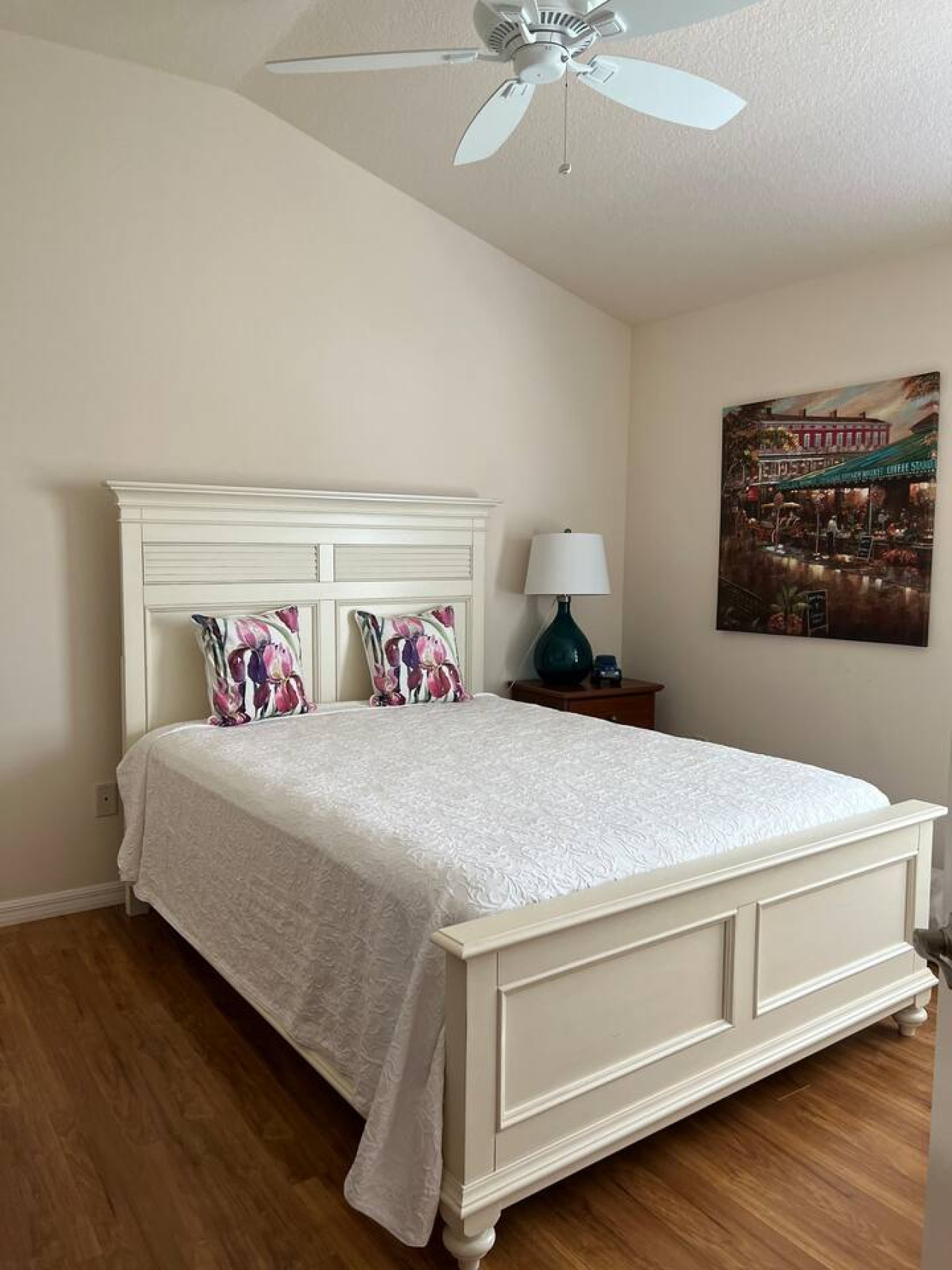 Very spacious 3/2 home at Villages of Dunedin. Fully equipped kitchen, bedrooms, and bathrooms. A very spacious master bedroom with a king size bed, a sofa, a dresser, and large TV. The master bathroom includes a private toilet area, double sink and walk in shower along with a large walking closet. The other two bedrooms have large wall closets and queen-size beds. Nice peaceful lanai to have your morning coffee or you can stay inside in the breakfast nook with a view to the ample kitchen or TV in the family room. The family room has comfortable recliners, and you have access to dine, play cards, or do puzzles in the dining area. The house has Wi-Fi with access to stream your favorite media, and Xfinity cable TV.